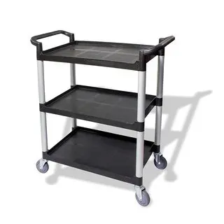 The Crestware LBTROLLEY is a heavy-duty, large 3-tier plastic utility/bussing cart designed for demanding foodservice, hospitality, and commercial settings, featuring durable construction, two handles for maneuverability, and a high load capacity (around 300 lbs), ideal for transporting dishes, supplies, or laundry efficiently. It ships knocked down (KD), and offers ergonomic design for smooth operation in busy environments, with optional bins for added function.