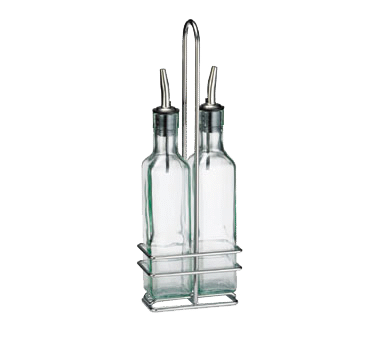 Introducing the TableCraft Products, H9085N, Oil & Vinegar Cruet Set, designed to ensure precision in tasks in a commercial restaurant setting. This set includes two 8-1/2 oz. square green tint glass bottles that are dishwasher safe, allowing for easy cleaning and maintenance. The stainless steel pourer, although hand wash only, guarantees a controlled and mess-free pouring experience, ensuring accuracy in every drop. The chrome plated rack, also hand wash only, provides a stylish and convenient storage solution, keeping your oil and vinegar bottles organized and easily accessible. With its durable construction and sleek design, this oil & vinegar cruet set from TableCraft Products is a must-have for any commercial restaurant, offering both functionality and aesthetic appeal.