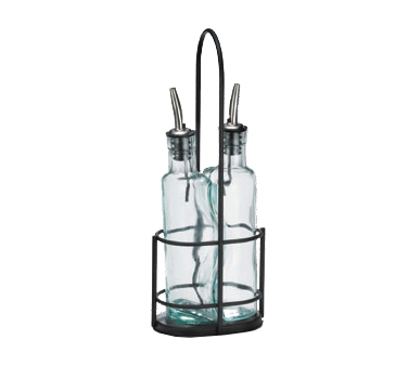 Stay competitive and innovative with the TableCraft Products, H918NBK Oil & Vinegar Cruet Set. This set is designed specifically for commercial restaurant use, ensuring that you can elevate your dining experience and impress your customers. The set includes two 8-1/2 oz. embracing green tint glass bottles, which are dishwasher safe for easy cleaning. The stainless steel pourer adds a touch of elegance and allows for controlled pouring, while the black powder coated metal rack keeps everything organized and within reach. Whether you're drizzling oil over a salad or adding vinegar to a marinade, this cruet set is a must-have for any restaurant looking to enhance their presentation and efficiency. Trust TableCraft Products for all your oil and vinegar needs.