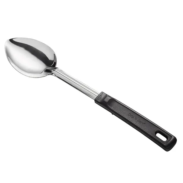 The Vollrath® stainless steel solid basting spoon is a perfect addition to any busy kitchen for basting, skimming fat, collecting drippings and more. The long handle helps you maintain a safe distance from food items and is heat-resistant up to 230°F, making this spoon ideal for hot foods. The handle also features a thumb notch that offers a comfortable grip and prevents the spoon from slipping into pots and pans.