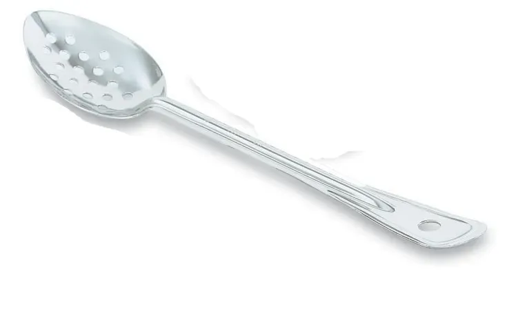 Baste, stir, strain and more with the 11-inch perforated stainless steel spoon by Vollrath. This long spoon keeps your hand at a safe distance from hot foods and offers an impressive reach. The grooved handle design adds strength and durability, and the stainless steel construction promises years of service. A hang-hole allows for convenient storage, and the smooth design promises easy cleaning.