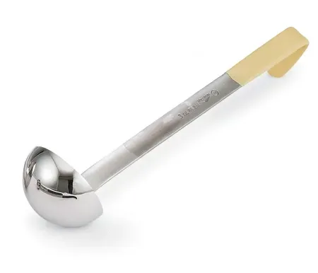 The stainless steel ladle by Vollrath helps you stir, scoop and serve with efficiency and ease. This versatile ladle is made of heavy-duty stainless steel that is fully functional up to 350°F and features a Kool-Touch handle. This insulated handle is color-safe up to 225°F, offers a comfortable grip and has all-natural antimicrobial properties. The precise bowl dimensions ensure accurate capacity, and the stamp on the handle allows for quick identification. With a hooked handle to prevent sliding into pots and a smooth, one-piece design, this ladle is easy to clean and a valuable addition to any kitchen.