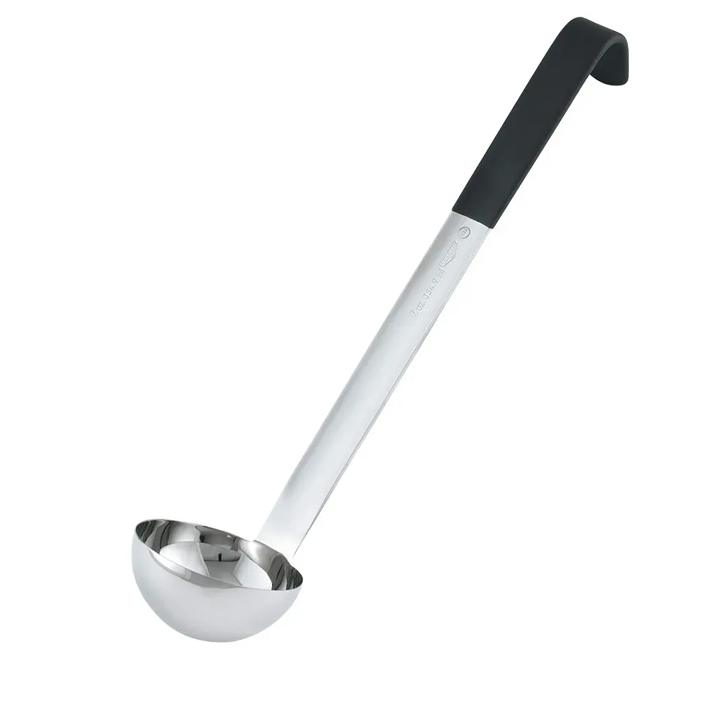 The Vollrath® stainless steel ladle allows you to stir, scoop and serve with efficiency and ease. This versatile ladle is made of strong stainless steel that is fully functional up to 350°F and features a Kool-Touch handle. This insulated handle is color-safe up to 225°F, offers a comfortable grip and has all-natural antimicrobial properties. The precise bowl dimensions ensure accurate capacity, and the stamp on the handle allows for quick size identification. With a hooked handle to prevent slipping and a smooth, one-piece design, this ladle is easy to clean and a valuable addition to any kitchen.