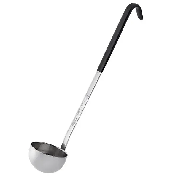 The Vollrath® 2-ounce round heavy-duty ladle is a reliable, versatile tool. Made of durable stainless steel, this ladle has a beautiful, shiny finish and features a grooved Kool-Touch handle that ensures a comfortable grip. This insulated handle is permanently bonded to the ladle, so it will not fall off and has all-natural antimicrobial properties that guard against harmful bacteria. The hooked design prevents the ladle from sliding and has a capacity stamp for quick identification. The handle is color-safe up to 225°F, and the stainless steel ladle is fully functional up to 350°F, making this ladle ideal for a wide range of hot food items.