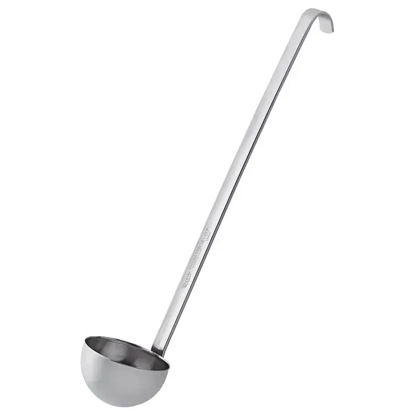 The stainless steel ladle by Vollrath is a staple in any commercial kitchen. The strong construction promises years of use; the sleek design is easy to clean, and the mirror-finish creates an attractive appearance. The hooked handle ensures convenient storage and prevents sliding into pots, while the grooved design adds strength for consistent, reliable performance.