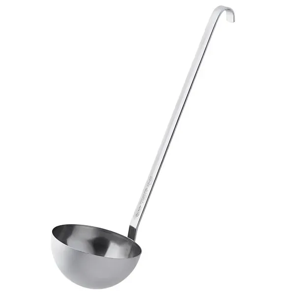 The stainless steel ladle by Vollrath is a staple in any commercial kitchen. The strong construction promises years of use; the sleek design is easy to clean, and the mirror-finish creates an attractive appearance. The hooked handle ensures convenient storage and prevents sliding into pots, while the grooved design adds strength for consistent, reliable performance.