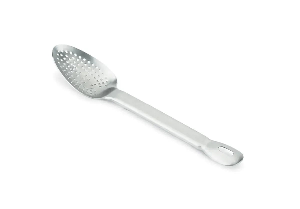 Reduce waste and maximize serving efficiency with the perforated basting spoon by Vollrath, which features a unique bowl shape that reaches into food pan corners perfectly. Made of heavy-duty stainless steel, this durable, one-piece spoon is resistant to corrosion, easy to clean and features a sleek satin finish that hides signs of wear. The strong handle offers superior strength and comfort, while the perforations drain away excess liquid quickly, making it an ideal choice for busy serving areas.