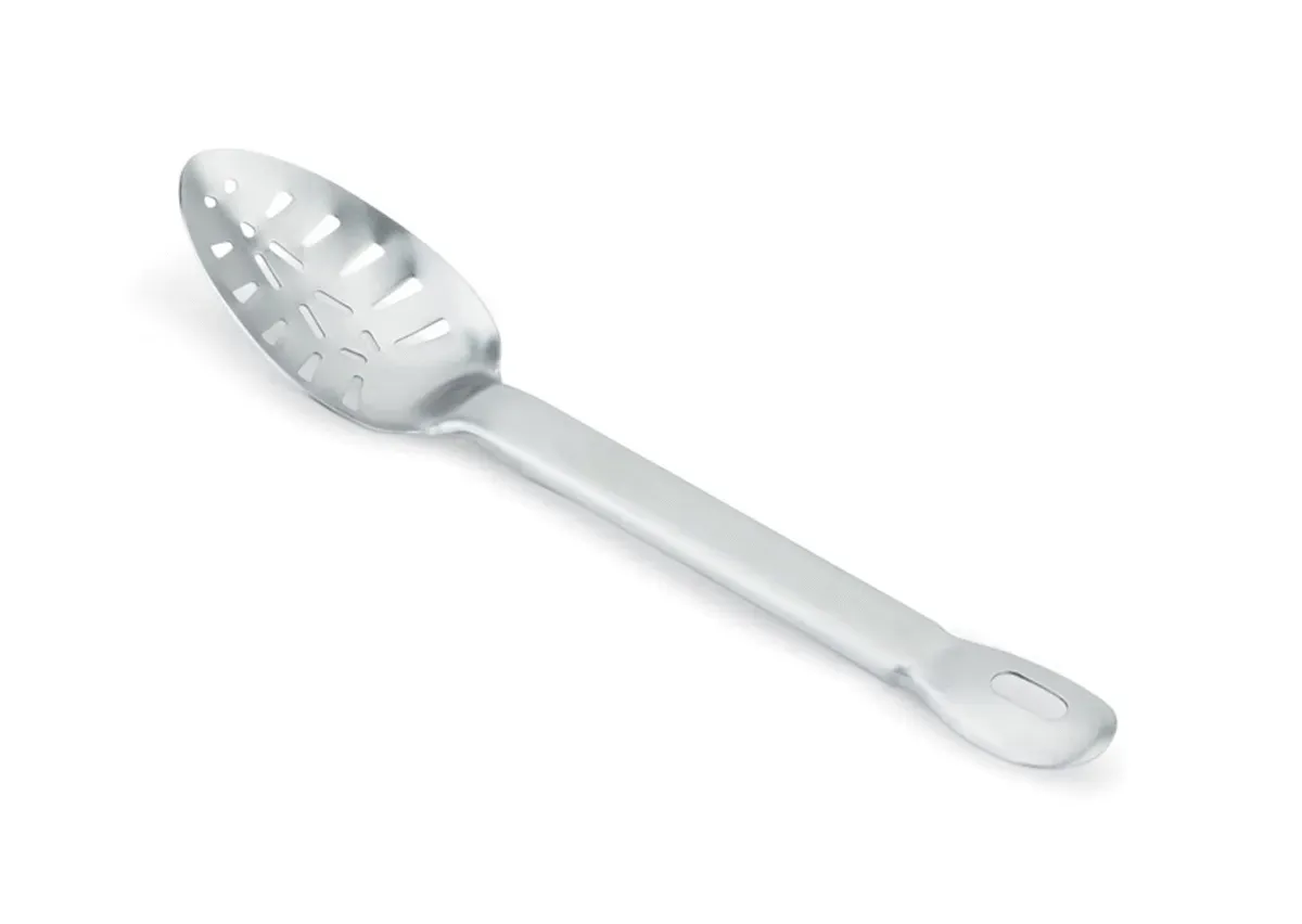 Reduce waste and maximize serving efficiency with the slotted basting spoon by Vollrath, which features a unique bowl shape that reaches into food pan corners perfectly. Made of heavy-duty stainless steel, this durable, one-piece spoon is resistant to corrosion, easy to clean and features a sleek satin finish that hides signs of wear. The strong handle offers superior strength and comfort, while the slotted design drains away excess liquid quickly, making it an ideal choice for busy serving areas.