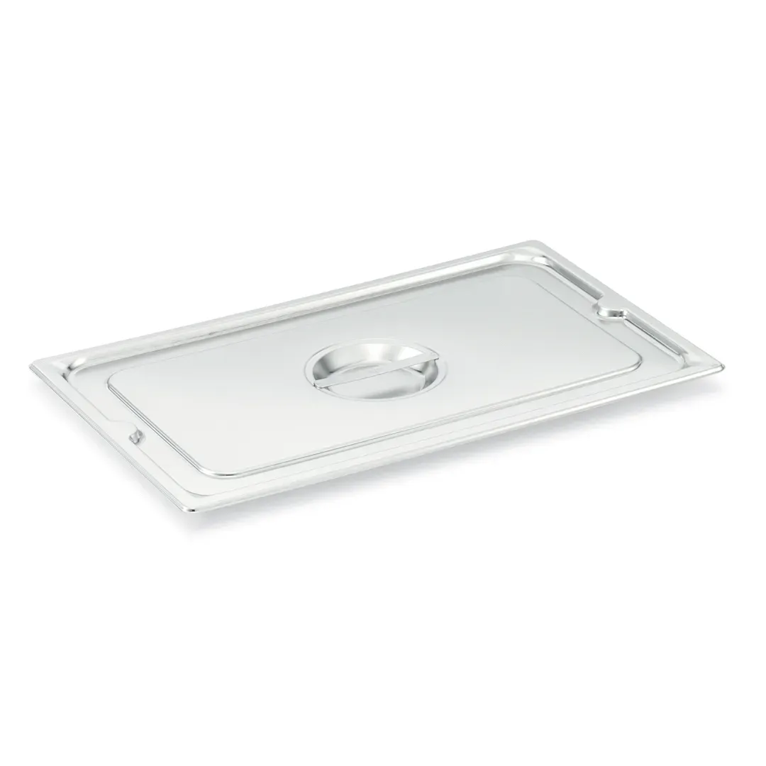 This sturdy 22-gauge 300-Series stainless steel cover securely fits the full-size Super Pan 3 pan. Its durable construction features a center flat handle for easy lifting and reinforced edges for added strength. This cover is EN631-1-compliant and NSF-certified.