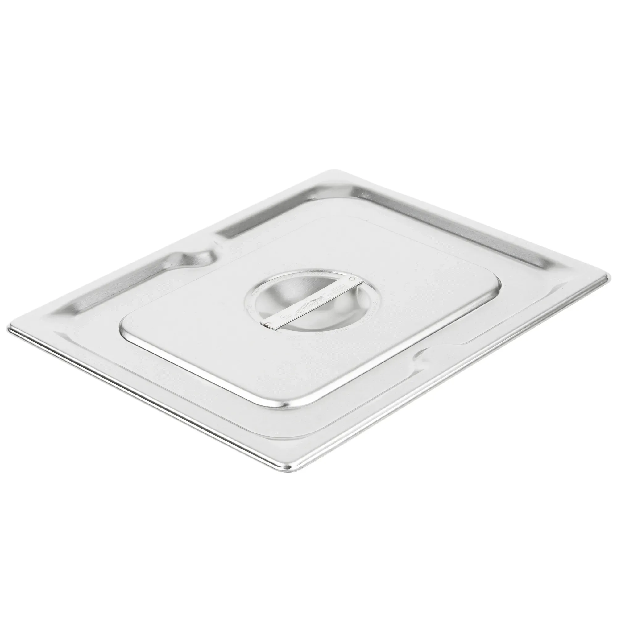 This sturdy 22-gauge 300-Series stainless steel cover securely fits the half-size Super Pan 3 pan. Its durable construction features a center flat handle for easy lifting and reinforced edges for added strength. This cover is EN631-1-compliant and NSF-certified.