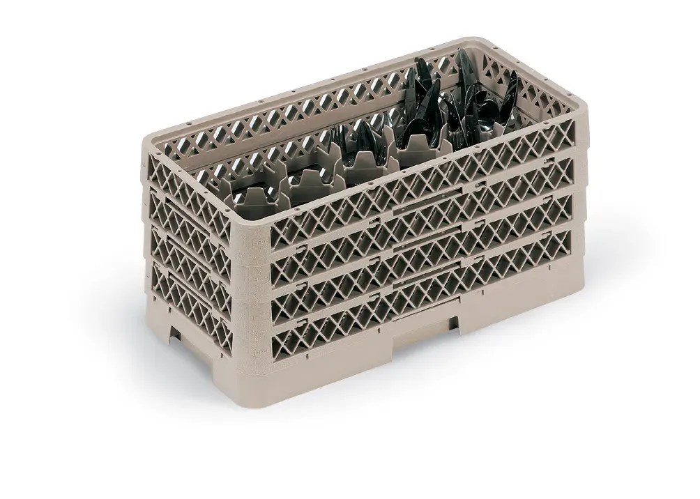 Invest in superior quality with the Vollrath HR2D1DDA Dishwasher Rack for Flatware. This half-size rack is designed to efficiently clean and organize your flatware in a commercial restaurant setting. With 17 compartments, it provides ample space to hold and separate your utensils, ensuring a thorough and hygienic wash every time. The rack measures 10"W x 19-3/4"D x 9-1/16"H and features handles on all four sides for easy handling and stacking. Made of durable co-polymer plastic in a stylish beige color, this dishwasher rack is not only functional but also visually appealing. It is NSF certified, guaranteeing its quality and safety for use in foodservice establishments. Trust Vollrath, a reputable vendor known for their high-quality products made in the USA.
