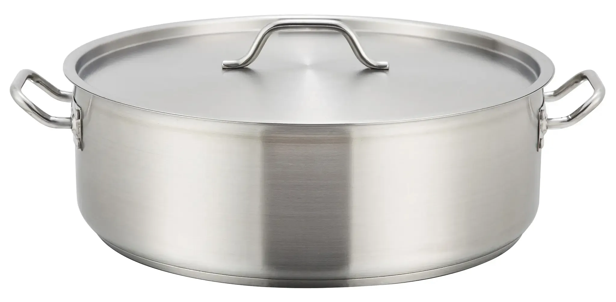 Add a touch of professionalism to the kitchen with the Winco Premium Brazier 20 qt. This high-quality brazier is designed to meet the rigorous demands of a busy restaurant environment. With a generous 20-quart capacity, it is perfect for preparing large batches of soups, stews, and sauces, making it an essential tool for any commercial kitchen. Crafted with a tri-ply heavy-duty bottom that includes an aluminum core, this brazier ensures even heat distribution, preventing hot spots and ensuring consistent cooking results. The 18/8 stainless steel construction not only provides durability but also makes it induction ready, offering versatility for various cooking methods. The brazier's dimensions, 15-3/4 inches in diameter and 6 inches in height, provide ample space for thorough mixing and cooking. The included cover helps to retain moisture and flavor, making it ideal for slow-cooking dishes that require a sealed environment. The NSF certification guarantees that this brazier meets the highest standards for public health protection, ensuring that your kitchen maintains its professional standards. While the model number SSLB-20 may not be the focal point, it signifies the quality and reliability associated with Winco products. This brazier is a testament to Winco's commitment to providing top-notch kitchen equipment that enhances efficiency and performance. Incorporate the Winco Premium Brazier 20 qt. into your kitchen arsenal and experience the difference in quality and functionality. This brazier is not just a cooking vessel; it's a cornerstone of culinary excellence.